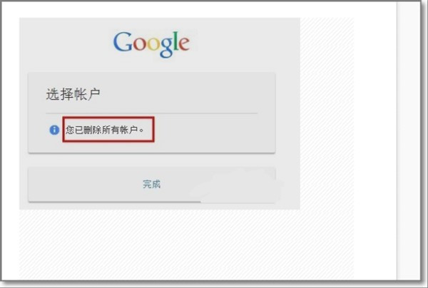 4、第四步,执行完上面的操作之后,提示已删除所有帐户,点击“完成”按钮继续,见下图,转到下面的步骤。