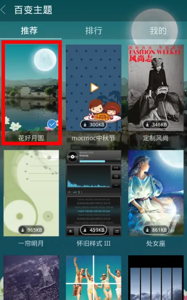 这时,有推荐、排行、自己的三个主题可以选择,这里以花好月圆为例子做介绍,点击它进行下载