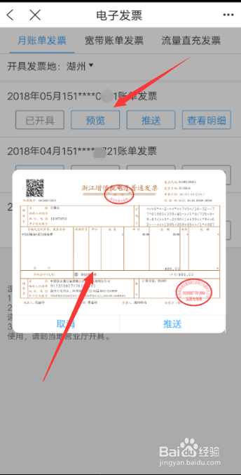 7.刷新页面后,发票显示已开具,点击预览可以看到发票情况。点击推送可以将发票通过短信或邮件方式发送。