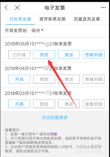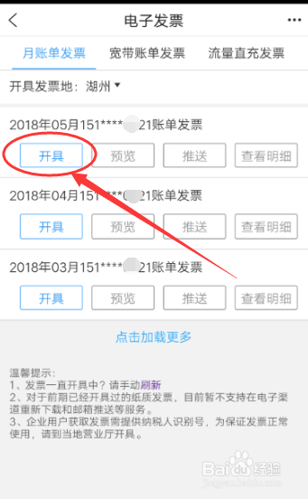 6.在新的页面中显示近三个月的账单发票可以开具,也可以点击加载更多,看到更多时间的消费发票,点开具按钮。