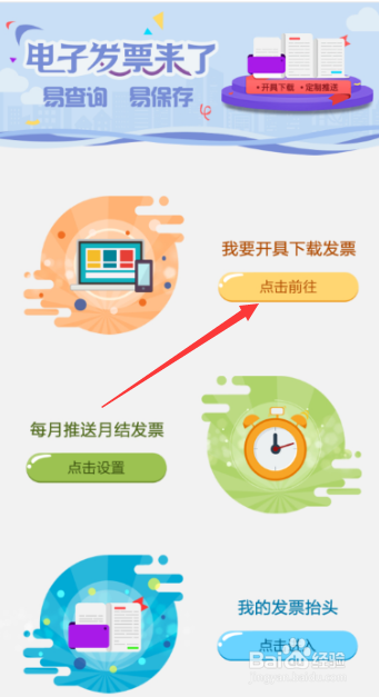 5.进入到电子发票页面,可以对发票信息进行设置,包括推送、抬头等设置功能,点击我要开具下载发票下方的点击前往按钮。