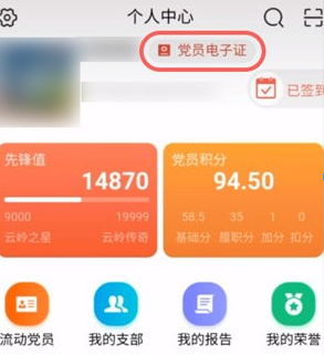 2、登录成功后,在【我的】页面的*上方点击【党员电子证】;