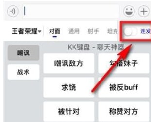 接着点击KK键盘上方栏目最右方的【连发】开启按键,将连发功能开启