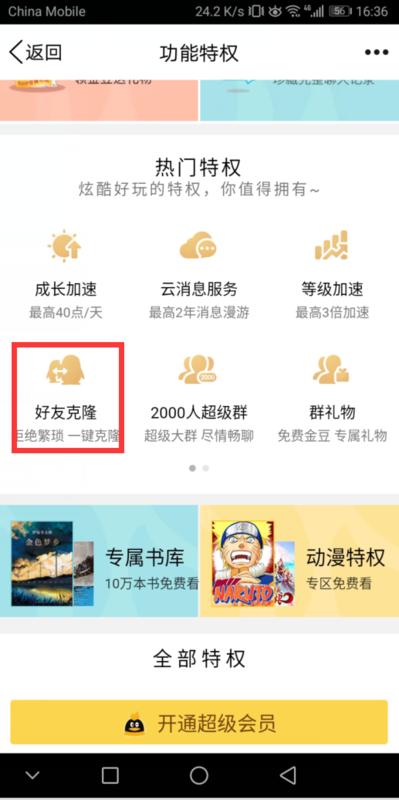 4、进入超级会员的功能界面,在界面中的”热门特权“中找到”好友克隆“功能