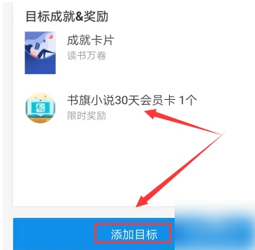 读书目标说明界面,目标成就和奖励获得成就卡片和书旗小说30天会员卡1个。