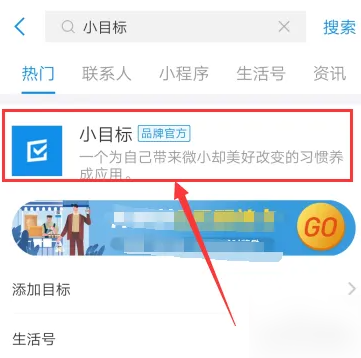 支付宝界面搜索栏输入“小目标”点击进入生活号。
