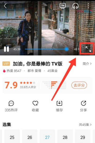 打开搜索到的视频,轻触播放画面,弹出操作栏,点击画面右下角【全屏】图标。