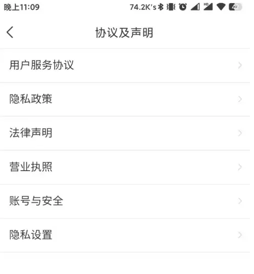 在设置界面中,找到协议及声明选项,点击后进入协议及声明界面。