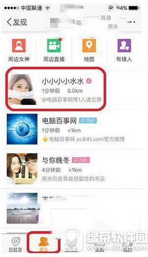 2、点击下面一排的“遇见”,再点击个人头像,如图: