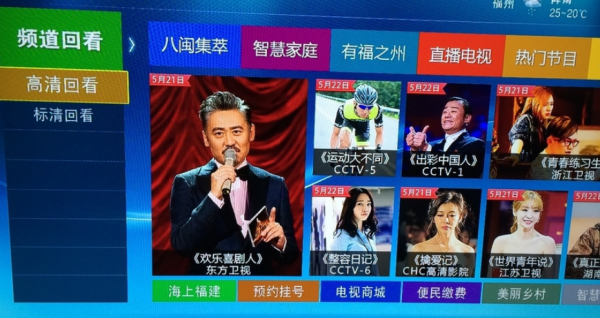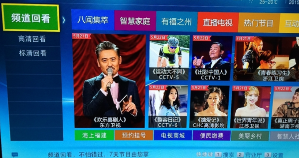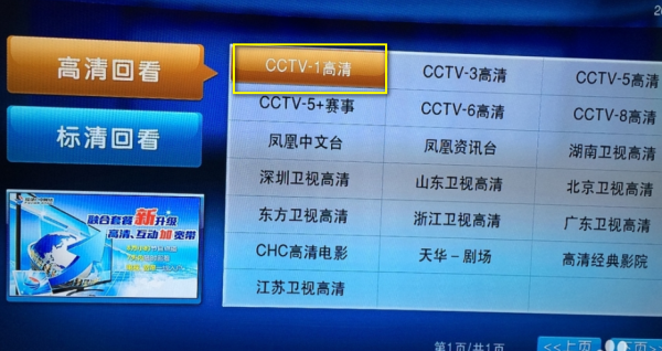 2、然后你想回看高清电视,就拿起遥控器按向下键,点击高清回看。进入高清回看界面后,就选择copy想看的电视的日期和频道点一下