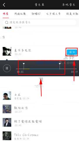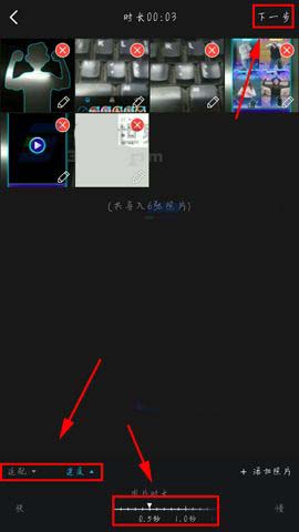 2)然后点击左下角设置完时长后点击【下一步】选项,然后选择要添加的【音乐】点击。(如下图)