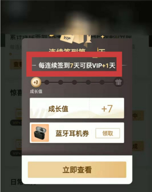 5.进入页面就会提示我们完成了今日的签到,页面会显示我们已经连续签到几天,根据页面提示框的内容可以看到我们需要连续签到7天就可以获得VIP+1天。