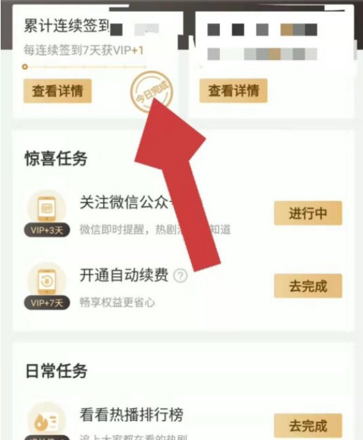 6.把提示框关掉后,可以看到在签到位置显示我们今日签到任务已完成,待我们连续签到7天时,就会显示恭喜获得VIP+1天。