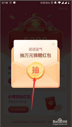 1、达到5000能量可以抽万元锦鲤红包,看脸,5000能量一次机会。