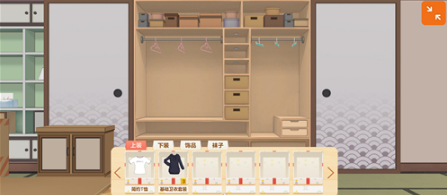 比如你想给胡桃换上简约T恤和牛仔裤,先将衣柜中的所有衣服都取出,然后点击上装【T恤】和下装【牛仔裤】。