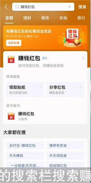 2025-11-22 16:20 来源:西西软件下载 作者:佚名首先打开【支付宝】客户端,然后点击首页面上方的【搜索栏】,在搜索栏搜索“赚钱红包”,点击进入【赚钱红包】小程序,