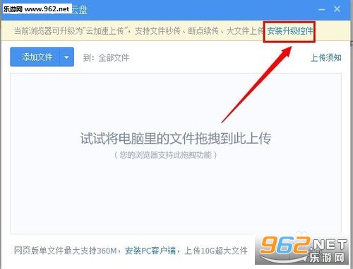 在打开的“上传文件至360云盘”界面中,点击“安装升级控制”链接。
