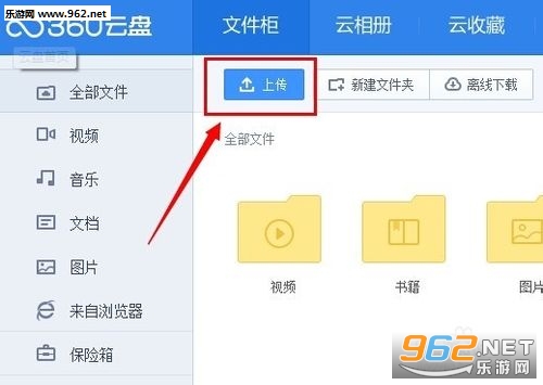 登陆“360云盘”网页客户端,点击“上传”按钮。