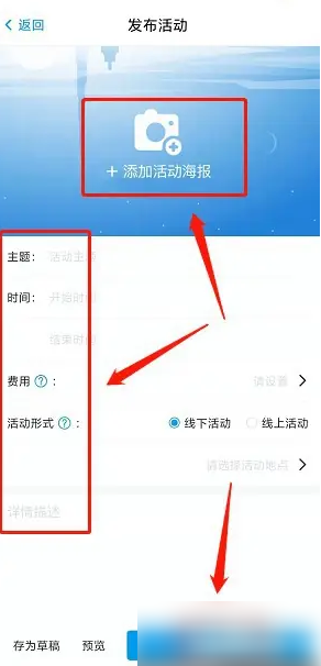 进入发布活动界面,添加活动海报、主题内容、时间、费用、活动形式、活动描述,点击"发布",如图所示