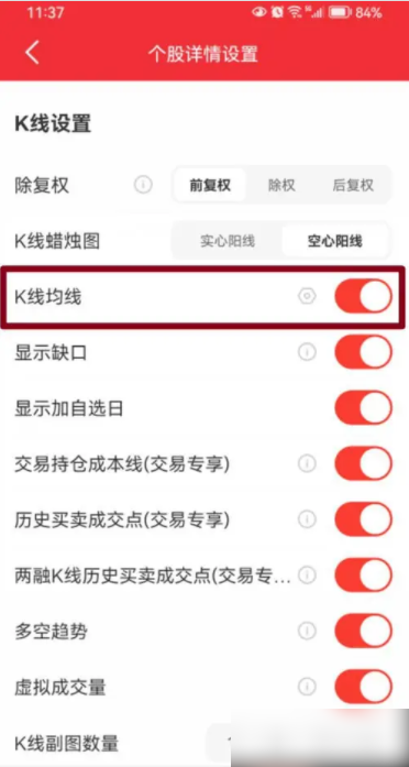 在【K线设置】项下,打开【K线均线】开关即可。