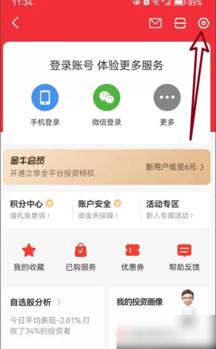 开启【同花顺】APP后,点击右上角六角螺母图标进入【设置】,如图箭头所示。