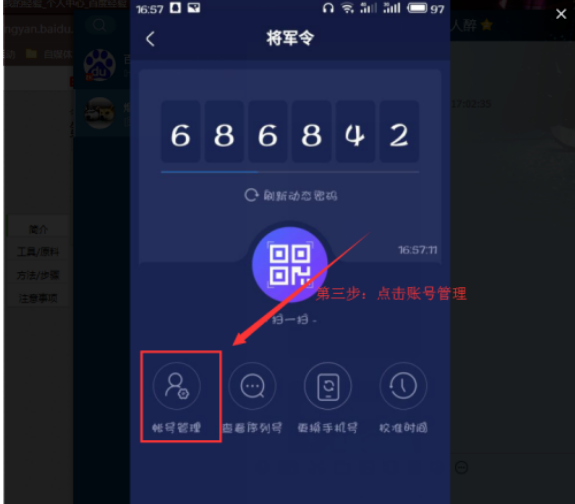 账号解绑网易将军令步骤三:点击口令显示模块以后,APP会进入网易将军令功能模块。用户点击界面上的“账号管理”。