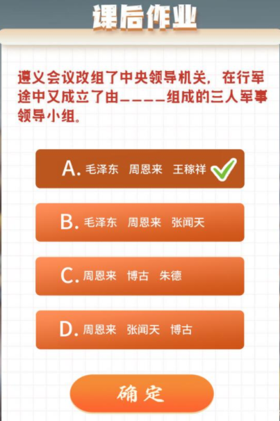 第6题:遵义会议改组了中央领导机关,在行军途中又成立了由___组成的三人军事领导小组。