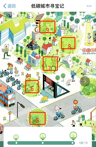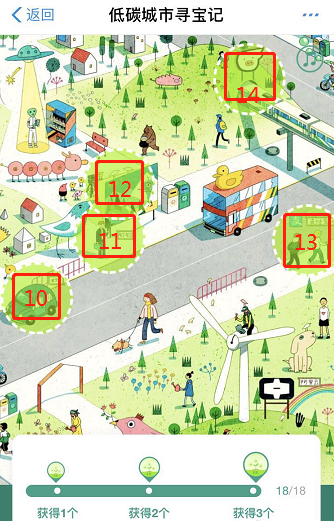 在进入到“低碳城市寻宝记”活动界面之后,用户们需要仔细识别图片上面的各种场景,按照下面的图片标识进行点击,从而解锁相应的场景。