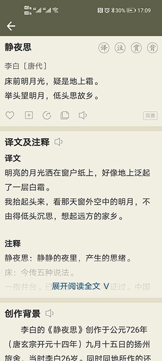 4、当我们找到想要的古诗文之后,点进去就会发现,软件已经为我们做好了详细的赏析,其中包含了作品原文、译文注释和创作背景。