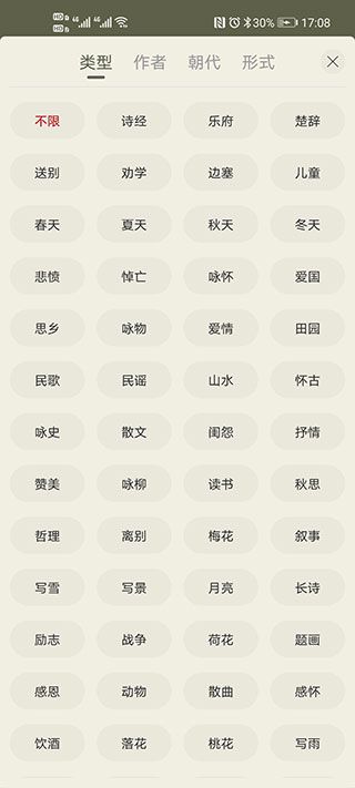2、用户也可以自己手动查找古诗文来进行阅读,软件已经按照类型、作者、朝代、形式分为四个大类,每个大类中还有若干个小类。