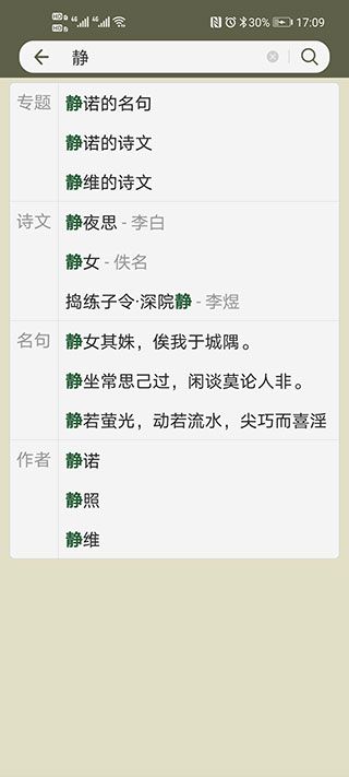 3、除了按照分类查找,用户还可以利用搜索框进行查找,只需要输入关键词,软件便会从专题、诗文、名句、作者中查找出相应结果。