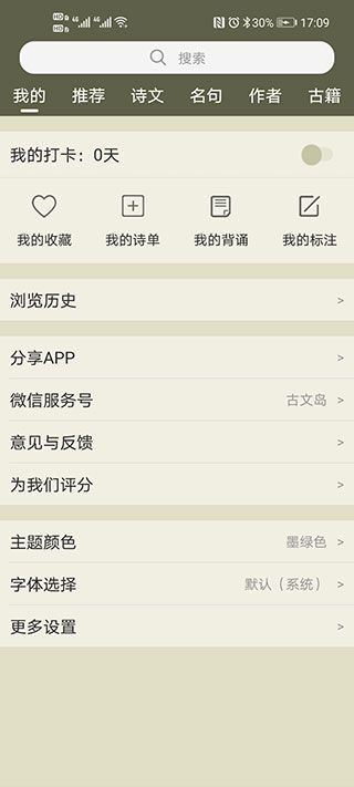 5、在我的页面中,你可以看到自己的一些个人信息,包括收藏、诗单、背诵、标注、浏览历史等,还可以对软件进行一些相关的设置。