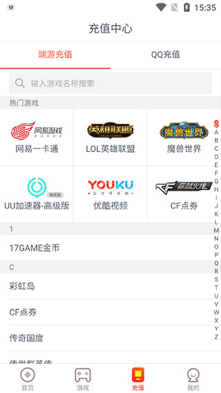 4、充值界面,不仅包含了网易游戏,还有多种游戏,玩家可以通过首字母来查询,并且还有礼包及充值优惠可以享受;