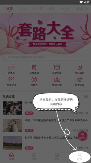 套路大全是一款可以帮助用户学习各种聊天知识的趣味软件,在这里为用户提供了各种土味情话、网上撩妹、异性搭讪、线下聊天等多种有趣实用的聊天套路技巧,轻松帮助用户更好的了解如何与异性用户进行聊天了。