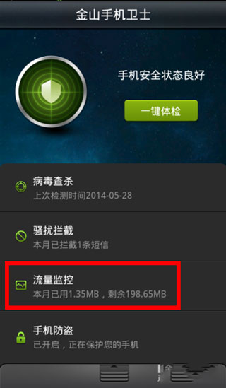 1、在手机上打开金山手机卫士,进入首页,选择流量监控