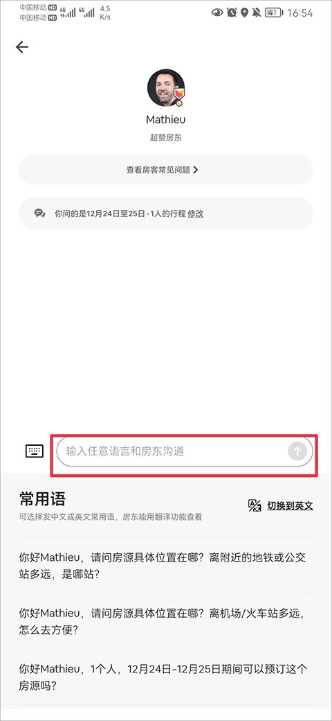 5、最后将你要询问的话输入在下方并发送后,就可以与房主进行各方面的询问了。
