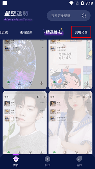登录星空透明壁纸app,点击充电动画;