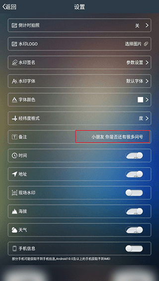 水印信息包括:经纬度、地址、时间、IMEI、备注以及图片
