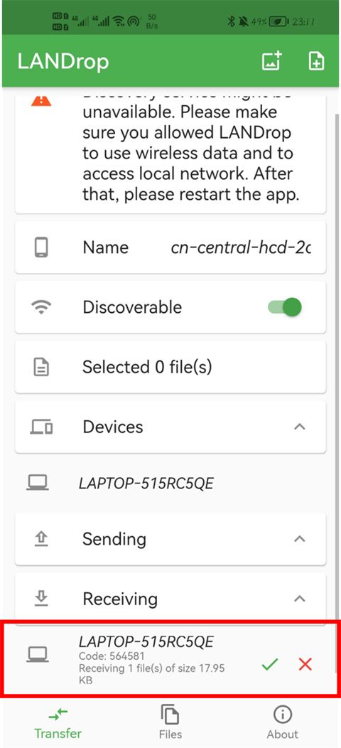 之后手机的软件界面会在Receiving栏弹出一个电脑发来的握手标志,点击"√",电脑就会自动将文件传输至手机上。