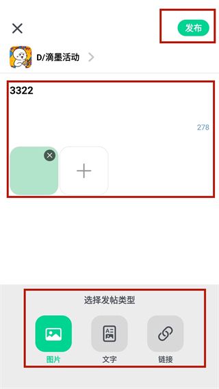 3、选择想要发帖的社区,根据自己的需求填入相关的信息,可以选择图片、文字和链接三种类型,填写完毕后,点击右上角"发布"按钮即可完成发帖。