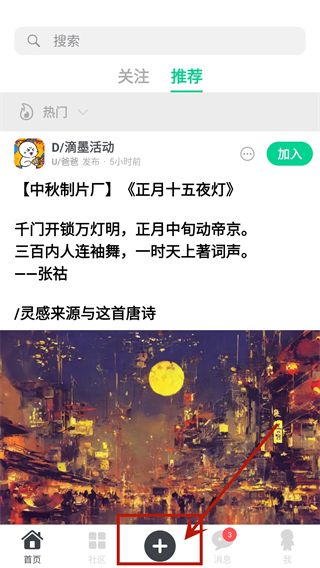 2、点击下方状态栏的"+"号跳转至发帖界面。