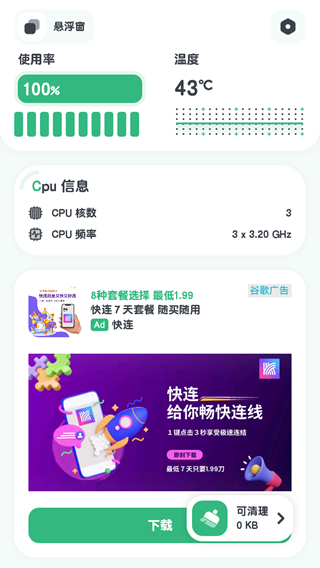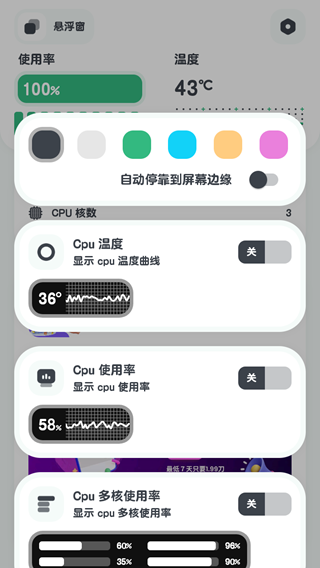 桌面悬浮窗和状态栏悬浮窗实时展示CPU温度、电池温度、内存使用率,强大又方便,实时信息想看就看。