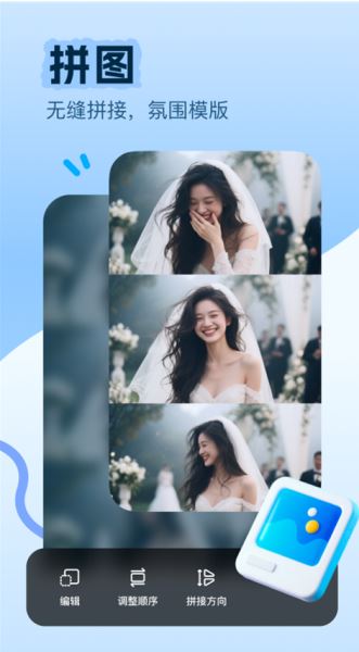 用户可上传至少2张图片,对上传的图片进行纵横拼接,拼接过程中,支持对图片进行替换,旋转翻转,调整拼接顺序、和拼接方向。