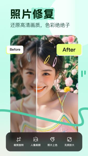 用户上传或者拍摄图片,美片对其自动进行高清放大处理,同时用户还可对其 进行裁剪、滤镜美颜、无损放大,上色。