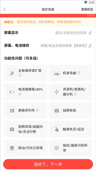 4、依次选择手机容量、购买渠道、网络制式、账号锁机况。