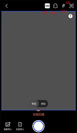 3、以"文档扫描"为例,进入后右上角可以调整画质像素、闪光灯以及裁剪比例等。