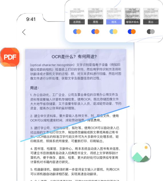 可对图像进行90度旋转,到达需要的几何图像,去掉图像中杂乱背景,使图像文档变高清。可修复图像中的水印、屏纹、手写文字等。提供锐化、省墨、增亮等滤镜。