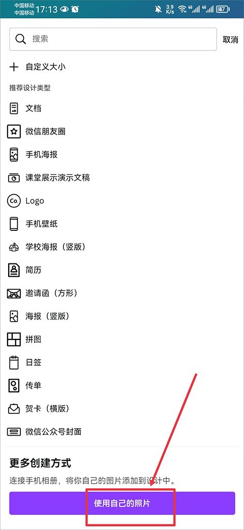 3、在相册中选择照片后,接着选择图片的大小,若下方大小不合适时,可以点击自定义大小,大小选择完成后点击创建即可。