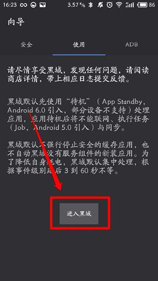 2、接着,在手机中运行"黑域"软件,仔细阅读他的向导;