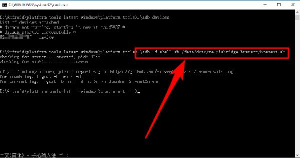 14、待我们的设备列举出来后,输入命令".\adb -d shell sh /data/data/me.piebridge.brevent/brevent.sh",从而完成我们对黑域手机端的授权;